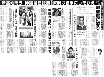 米軍新基地建設に伴う埋め立ての賛否を問う沖縄県民投票は24日が投票日です。菅義偉官房長官は告示日に県民投票がどういう結果になっても工事を進める方針を発表しました。(1面、4面、5面)