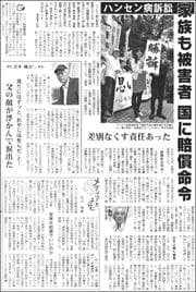 ハンセン病元患者の家族561人が、国の誤った隔離政策で差別を受けたとして国に謝罪と賠償を求めた集団訴訟で熊本地裁は6月28日国の責任を認め総額3億7675万円を支払いを命じました。(32面)