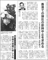 日本共産党の志位和夫委員長は14日の記者会見で「香港での弾圧の即時中止を求める」と題する生命を発表。同日、在日中国大使館を通じて同政府に伝達しました。(2面)