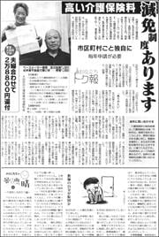 65歳以上の介護保険料の全国平均基準額は月5869円です。制度が始まった2000年度・2911円の2倍です。介護保険法では市区町村が独自に介護保険料を減免できるとしています。東京・大田区では...。(32面)