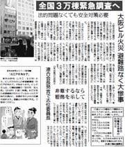 大阪市北区の雑居ビルで25人が死亡したビル火災で金子恭之総務相は19日、雑居ビル約3万棟に緊急の立ち入り調査を実施し、結果を報告するよう全国の消防本部に要請したことを明らかにしました。