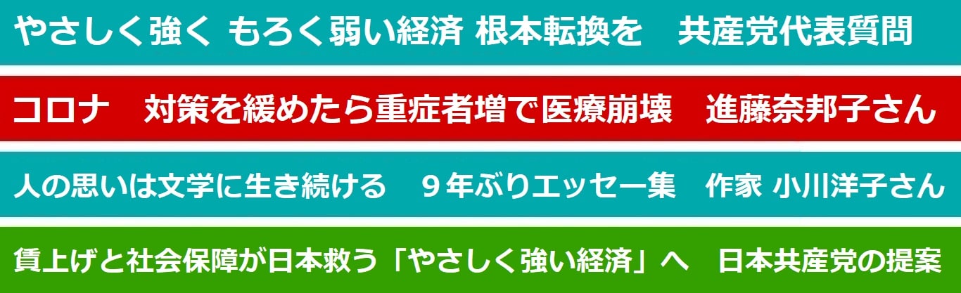 国会は岸田文雄首相の施政方針演説を受けた各党代表質問が行われ、日本共産党は衆院で志位和夫委員長(20日)、参院で小池晃書記局長(21日)が岸田政権の内政・外交をただし対案を提起しました。