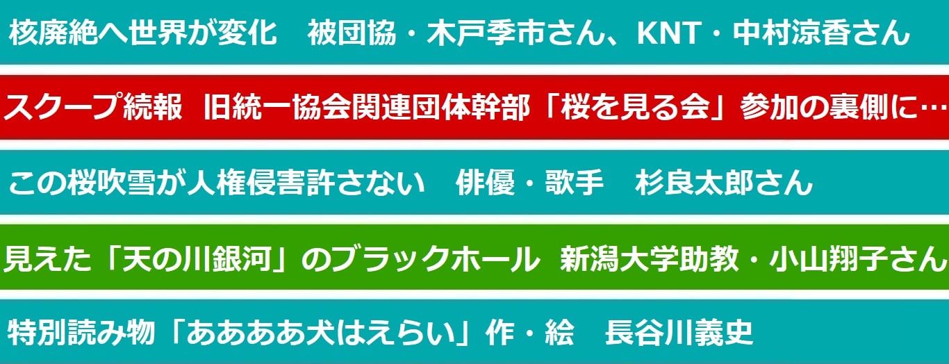 日曜版(7月31日号)で報じた、「桜を見る会」の旧統一協会の関連団体幹部が招待されていた問題で新展開です。この幹部は自民党に入党し、総裁選で安倍晋三元首相を応援し、同氏に投票。桜を見る会への招待理由について“安倍氏を応援したから”と語りました。