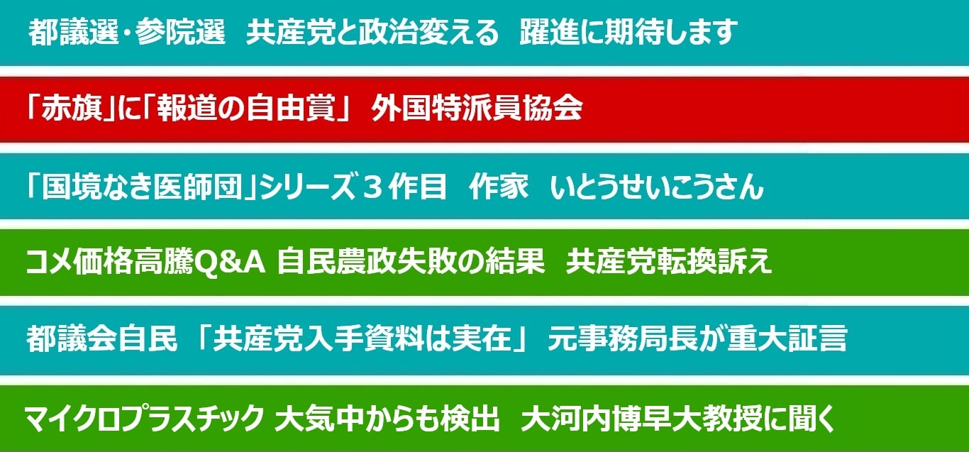 消費税減税、「アメリカいいなりでいいのか」に加え、コメ問題などが大争点に浮上してきた東京都議選(13日告示22日投票)、7月の参院選。どの問題でも日本共産党の提案の先駆性が明らかになり、各地で市民との共同も広がっています。