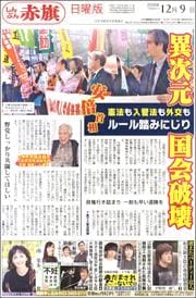 野田佳彦首相の新政権発足―。どんな特徴があるでしょうか。見えてきたのは、消費税の大増税など国民に痛みを押し付ける、民主、自民、公明による「大連立」―悪政の翼賛体制加速の動きです。日本共産党の志位和夫委員長は、アメリカいいなり・財界中心という古い政治をすすめる「民自公翼賛体制」か、「国民が主人公」の新しい日本をめざす日本共産党か―ここに真の対決構図があると語りました。主婦連合会会長の山根香織さん、前宜野湾市長の伊波洋一さん、ジャーナリストの斎藤貴男さんに話を聞きました。野田新首相の語録から、増税、改憲、侵略美化の持論を紹介します。