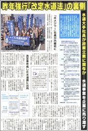 水道事業への民間企業参入を促進する改定水道法の10月実施を前に、懸念が広がっています。同法案作成部署には水道「民営化」ビジネスを狙う水道大手の複数の社員が「天上がり」していました。アジア太平洋資料センター共同代表の内田聖子さんにも話を聞きました。(16、17面)
