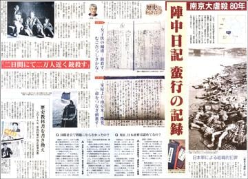 12月で、日本軍の残虐性を象徴する南京大虐殺(1937年)から80年。自民党議員の一部や侵略戦争を肯定・美化する勢力はいまだに「虐殺はなかった」などと攻撃しています。しかし兵士たちが残した陣中日記には、まぎれもない事実として虐殺が記録されています。