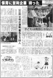 保育所の待機児童が約1300人と全国で最多の名古屋市。河村たかし市長が「早期解消」を名目にねらうのが、営利企業の参入です。市民から「保育を金もうけの道具にするな」「公立保育園の増設こそ」と反対運動が広がっています。
