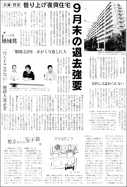 阪神・淡路大震災(1995年)で、兵庫県と被災各市がUR(都市再生機構)などから借り上げた復興住宅。県などは入居者に「契約期限は20年」だとして退去を求めています。西宮市は9月末で20年の契約が満了する借り上げ住宅の入居者に月末までの退去を強硬に迫っており、事態は切迫しています。