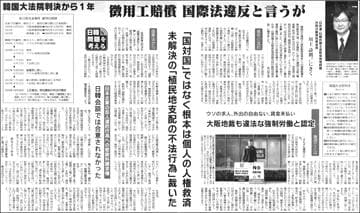 韓国の元徴用工(強制動員被害者)への損害賠償を新日鉄住金(現・日本製鉄)に命じた韓国大法院(最高裁)判決から(18年10月30日)から1年-。徴用工裁判に詳しい川上詩朗弁護士に聞きました。(6、7面)