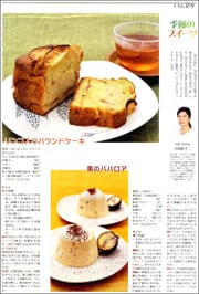 お菓子研究家の本間節子さんの「季節のスイーツ」。実りの秋に、旬の果実で作るお菓子を楽しみませんか。紹介するのは、栗(くり)のホクホクした食感と甘みが口の中に広がる「栗のババロア」と、リンゴをまるごと1個使った「リンゴ入りパウンドケーキ」です。