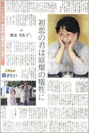 女優の渡辺美佐子さん(83)。28年間、演じ続けた一人芝居「化粧 二幕」(井上ひさし作)や31年続く原爆の朗読劇が評価され、今年5月、第16回坪内逍遥大賞受賞しました。NHKスペシャルドラマ「戦艦武蔵」(9月3日放送)では、19歳で夫を亡くした妻を万感の思いで演じます。