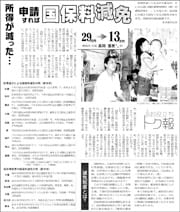 高過ぎる国民健康保険料(税)を滞納すると保険証を取り上げられ、窓口負担が10割になります。急病で困った時は、市町村の窓口で、申し出れば無条件で短期保険証が交付されます。(32面)