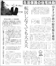安倍政権による生活保護利用者の家賃給付(住宅扶助)引き下げ。低家賃のアパートへ転居を強要される事態が起きています。日曜版の記事を使ってはね返した事例を紹介します。