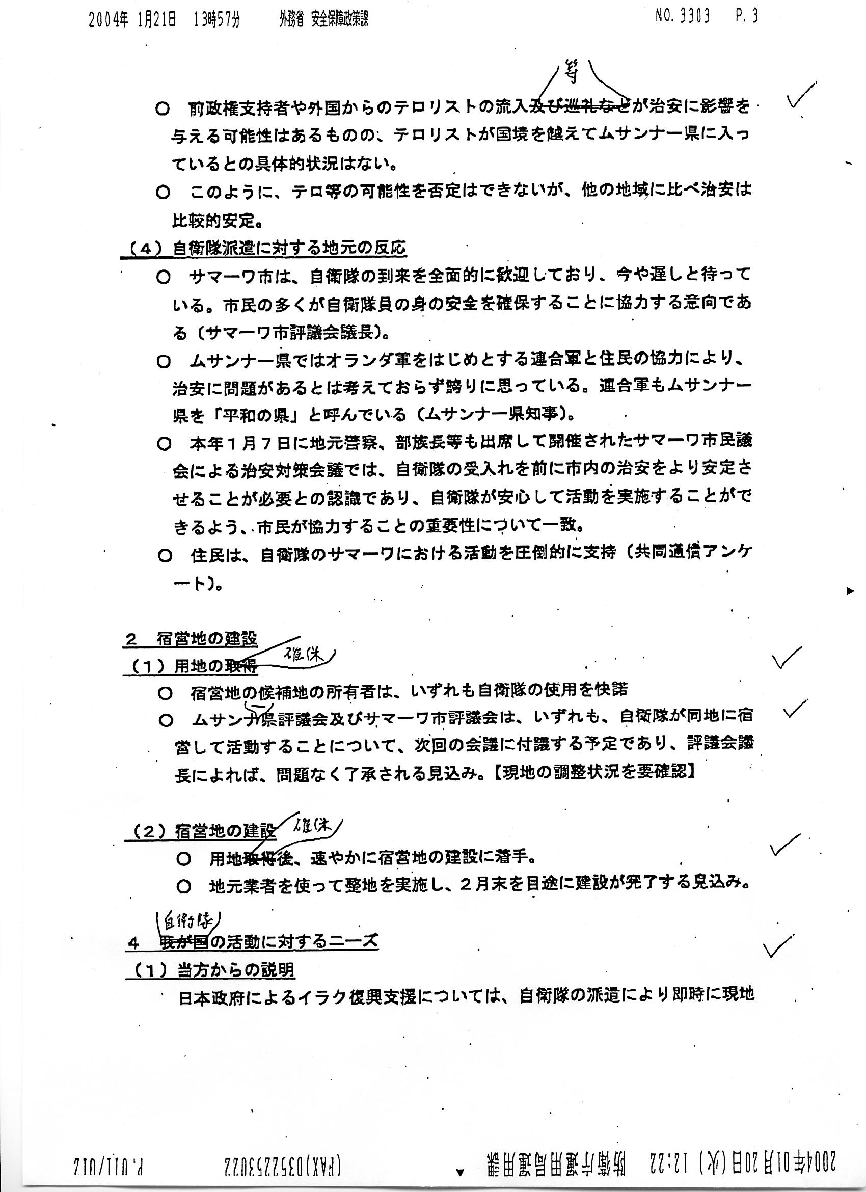 “サマワは派兵歓迎”演出を/政府、先遣隊に情報集め指示/赤嶺議員 内部文書を示し追及/報告書をあらかじめ準備(1/29)