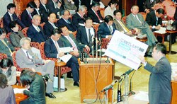 パネルをかかげ、医療改悪法案について質問する小池晃政策委員長=3日、参院決算委 |