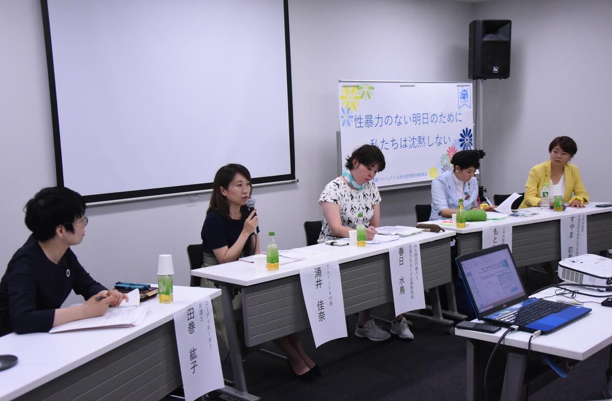 涌井さんは裁判などの事例を紹介しながら、「支配と被支配の関係の中に性暴力があり、被害者は地位や立場を悪用され抵抗できない精神状態にある」と指摘。「被害の現状、当事者の声を聞いて、実効性のある法制度ができてこそ、支援や教育につながる。性で傷つく人が一人でも減る社会にしていく大きな動きにしていきたい」と述べました。
