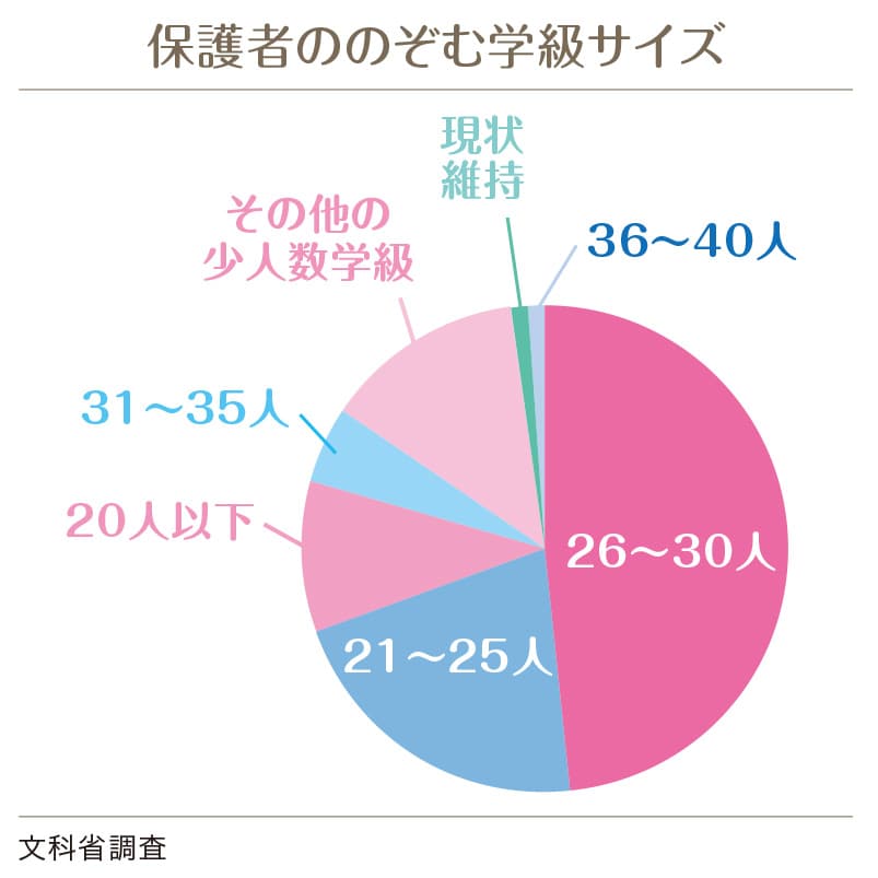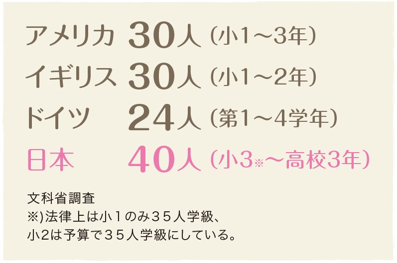 1人の先生がみる生徒数がへれば、きめ細かく教えられるにきまってる。子どもの発言回数がふえる。子どもの話をじっくり聞いてもらえる。小さいクラスは学力にも生活面にもプラスです。