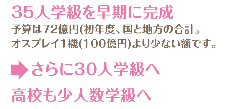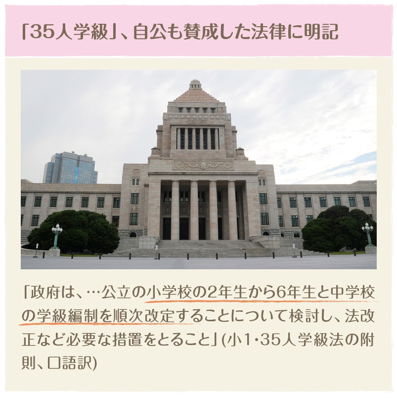 小1を35人学級にする法律には、「小1で終わりにせず、中学3年まで実施するように」と明記されています。自分たちも賛成し全会一致で決めたことに、背を向ける自公政権は許せません。