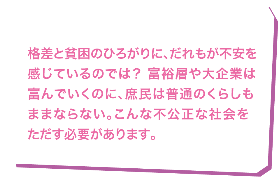 日本でも格差はひろがりつづけています。アベノミクスで恩恵をこうむったのは、株価でもうける大株主や円安でうるおう輸出大企業だけ。貧困ライン以下の生活はいまや6人に1人にも達します。8割以上の国民が「貧困は他人事ではない」と感じています。