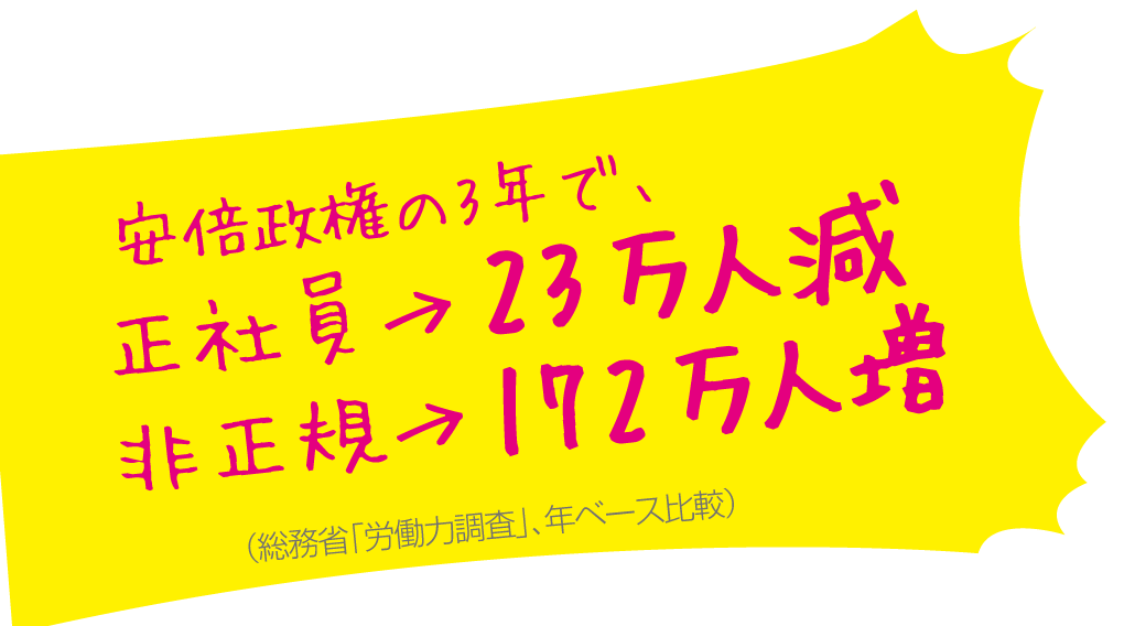 過労死や過労自殺までうむ異常な長時間労働を法律で規制する。若者をモノ扱いして、使いつぶすような働き方をやめさせる。有給休暇をはじめ権利をしっかり保障する───人間らしい働き方と個人の生活をまもるルールをつくることが、格差と貧困からぬけだすカギです。