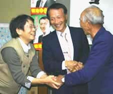 ![]() 支持者と当選を喜びあう菊池村長(中)と妻の智子さん(左)=11日、長野県南牧村 |