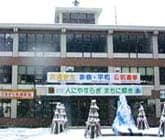 雪の舞う湯沢市庁舎