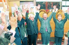 | 当選を決め万歳三唱をする田中勝己新町長(右から2人目)。左へ後援会長、相談役。右端は憲江夫人=27日、木曽町の田中事務所 |