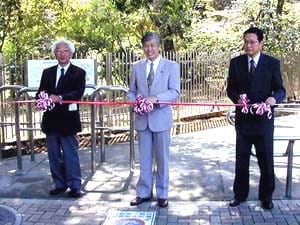 ![]() 小田急狛江駅前に開設した弁財天池緑地保全地区のオープニングセレモニーでテープカットする矢野市長(中央)=02年4月1日、狛江市 |