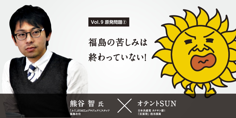 アロハー! 自然大好きオテントSUNで~す。今日は、福島に飛んできちゃいました! というのも、毎週金曜日に再稼働反対を訴えている「ふくしまSMILeプロジェクト」のスタッフ、熊谷智さんに原発問題についてインタビューするからさ! 今回は、原発への怒りで取り乱さないように、ちゃんとインタビューするYO! 熊谷さん、こんにちWAO!