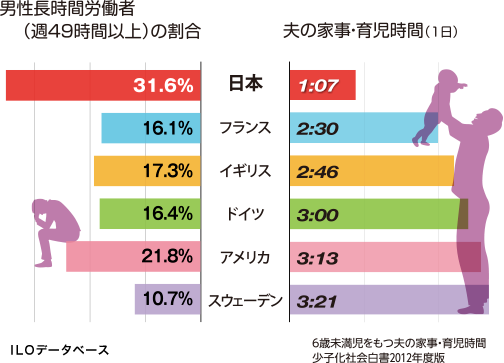 ケンリー: ハーイ!ハジメマシテ♡ ワタシは、ジョセイーノ・ケンリーといいマス。ニッポンのヒト、男性も女性も、働きすぎデス。ヨーロッパと全然チガウ。ドイツでは、2016年までに、夜6時以降は仕事を禁止する法律の検討が始まってマス。ヨーロッパみたいに労働時間短ければ、男のヒトも、もっと家事・育児に参加できると思いマース!