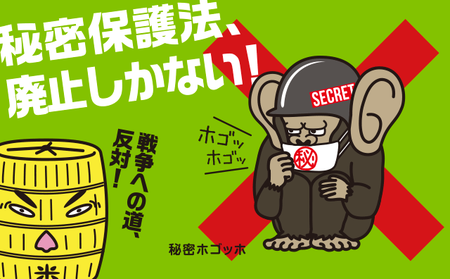 秘密保護法のもとでは、国民には「何が秘密かも秘密」にされる。で、それを知ろうとしたというカドで逮捕されたり罰せられたりする。「国防のため」「テロを防ぐため」―そんな口実で政府が「秘密」と決めれば、国会議員もジャーナリストも、ほぼ永久にそれを知ることはできねえ。でも、政府が信用できるか? 3・11原発事故のとき、この国は、国民にウソをつくって思い知ったべさ。