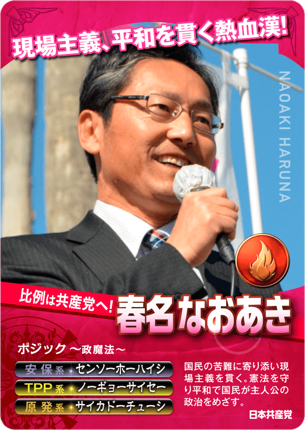 福井県の日本共産党、民進党、社民党、緑の党は、連合福井事務局長の横山龍寛(たつひろ)氏(51)を4党統一予定候補として正式に発表しました。4野党と26の市民団体、個人からなる新組織「ピースふくい」は、横山氏と「安保法制廃止と集団的自衛権行使容認閣議決定撤回のために全力をあげる」とする政策合意書を交わしています。(4月12日)