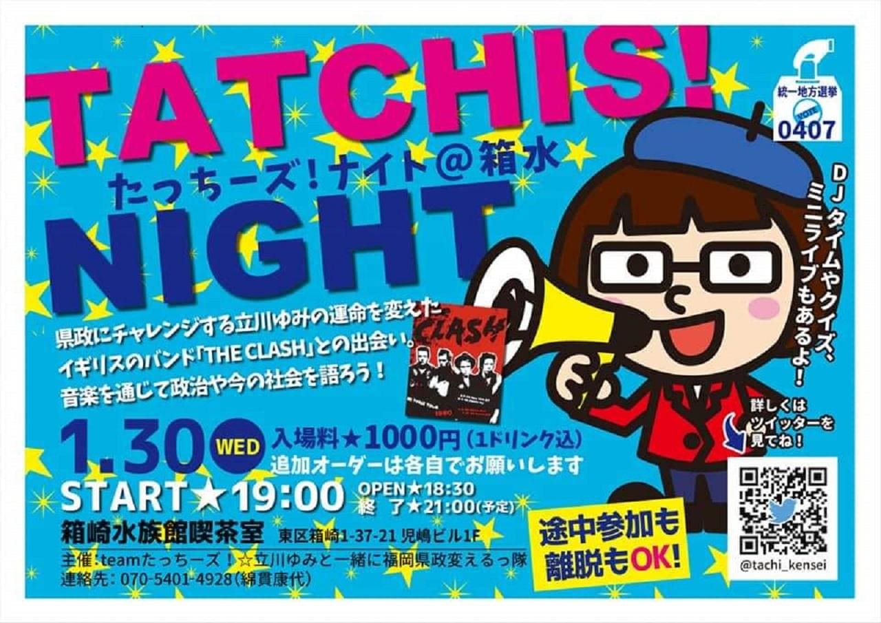 1月30日には、「たっちーズ!ナイト」を開催し38人が参加。立川さんが政治に関わりはじめた原点であるパンクロックのミニライブや県政クイズで盛り上がりました。「女性の政治進出を阻むガラスの天井を破ってほしい」「私のような保守層を味方につけて」など、路上でつながった7人のメンバーの思い思いのスピーチが会場を沸かせました。