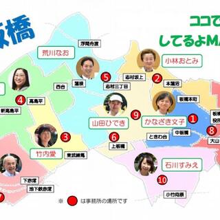 東京・板橋区では、9人の区議や予定候補の活動地域がひとめで分かる活動地域マップを作り、バナーにしてTwitterで発信しています。