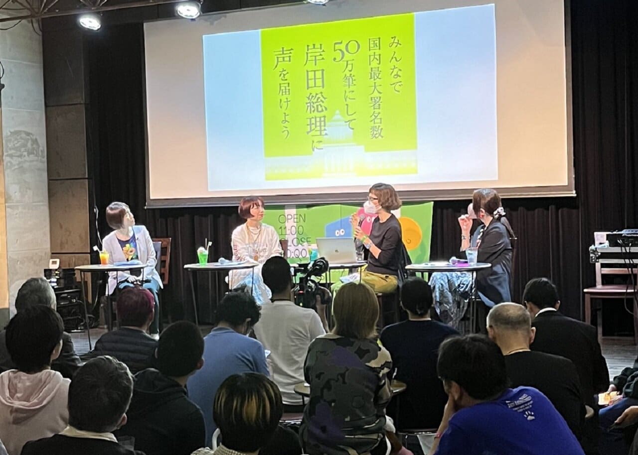 小池晃書記局長と吉田あやか三重県議、作家のアルテイシアさんが、トイレへの生理用品設置や痴漢問題についてトークしました。会場からもモヤモヤや質問を募り、「いつになったら選択的夫婦別姓制度ができるんでしょうか?」「日本の性教育にとって必要なことは何だと思いますか?」などに3人がそれぞれ自分の思いを答えました。「まだまだ若い人でさえ男性性が残っているけど、少しずつ変化していることがわかりました。アル(テイシア)さんが最後におっしゃたように『編み物のひと編みひと編み』(のように)頑張っていきましょうと希望がもてた点がよかったです」「すごい熱気、あっという間の1時間でした。夫婦別姓実現しま しょう」と寄せられるなど、ミソジニーやバッシングが行われるような社会はおかしい、変えようという決意で一体感のある場になりました。