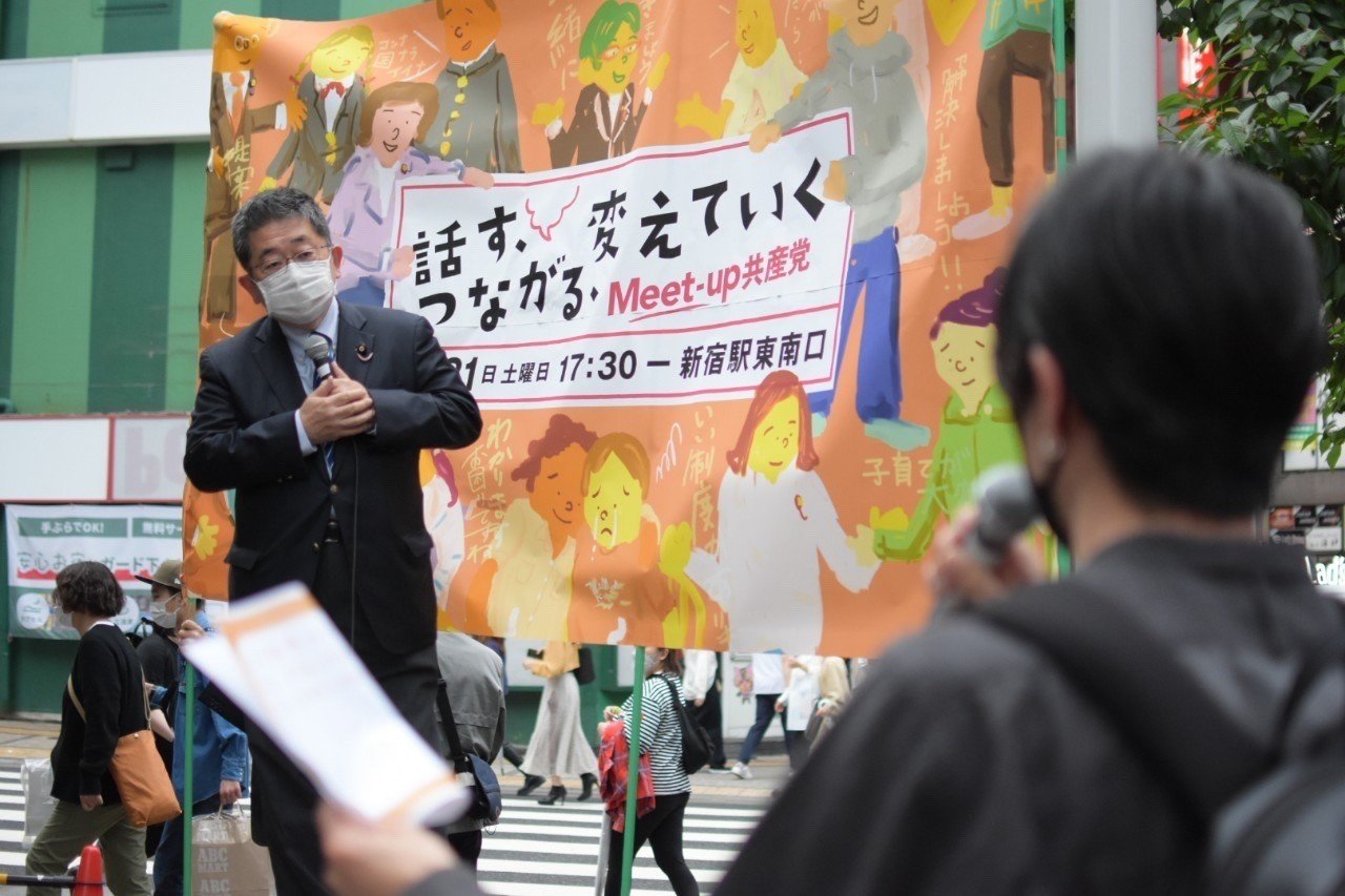 JCPサポーター街宣「Meet-up 話そう、つながろう、変えていこう」5月21日(土)JCPサポーターの街頭宣伝「Meet-up 話そう、つながろう、変えていこう」を開催。小池晃参議院議員・書記局長と山添拓参議院議員が、市民の皆さんと対話しながら、暮らしや平和への不安を聞き、どうすれば政治を変えられるのかを考えました。