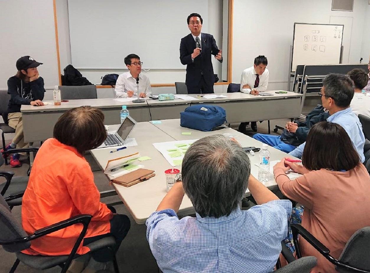5月19日、統一地方選挙と衆議院大阪12区補選の経験から、参院選にむけた取り組みを活性化させようと、「JOINUSツアー2019大阪~市民とともにたたかうワークショップ」を開催。JCPサポーターのみなさんとともに、12区補選に無所属立候補した宮本たけしサポーターの方々など約50名が参加しました。日本共産党からは、山下よしき副委員長・参議院議員、たつみコータロー参議院議員、宮本たけし前衆議院議員も参加し、知恵を出し合いました。