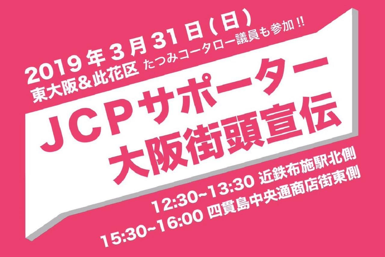 そんな共産党を応援しようと、大阪のJCPサポーターのメンバーが3月31日(日)に2カ所で街頭宣伝を計画。たつみコータロー参議院議員も参加します。大阪のサポーターのみなさん、ぜひ盛り上げていきましょう。