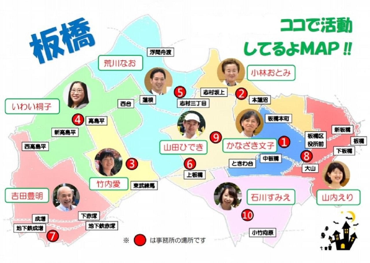 東京・板橋区では、9人の区議や予定候補の活動地域がひとめで分かる活動地域マップを作り、バナーにしてTwitterで発信しています。