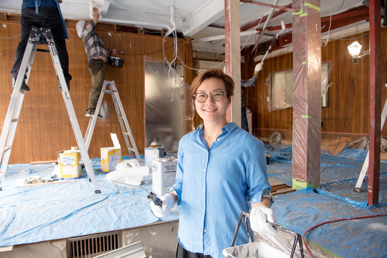 解体で発生した廃材も撤去され、天井塗装と錆止め塗装を行いました。上記写真は塗装前と塗装中。なかなか綺麗に塗れていますね。どうやらムラになりにくい様に前日から塗装屋さんが入り、下処理をしていただいたようです。鉄骨は細かい形状をしているため、刷毛やローラー、吹き付けなどで塗装されていきます。池内さおりさんも現場にきて作業されました。 〇8月5日「塗装ワークショップ」