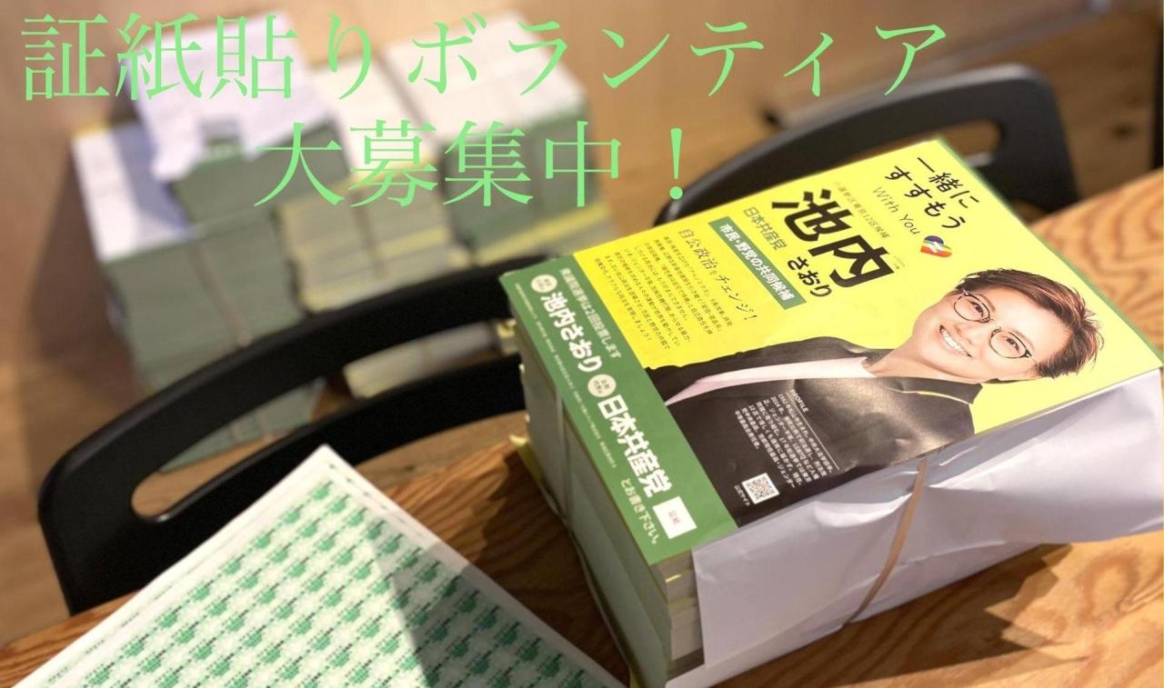 証紙貼りボランティアをバナーに日程を付けてツイッターに投稿したところ、7万枚のチラシの証紙貼りが3日で完了。サポーターズと市民のボランティアによって神奈川9区で選挙に立ってくれた斉藤のどかさんを応援したいとがんばっています。