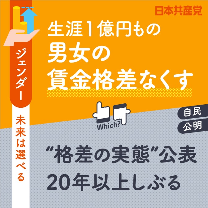 日本はジェンダー指数で世界120位――自公政権は、生涯賃金で1億円にものぼる男女の賃金格差の是正に手を付けてきませんでした。共産党は国会でくりかえし「企業に格差の公表義務付けを」と要求し、実現しました。さらに選択的夫婦別姓の導入、痴漢・性暴力の根絶に向けて全力を尽くします。