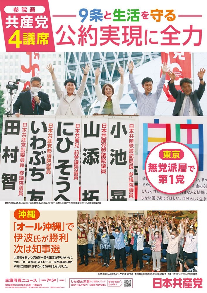 参院選共産党4議席 9条と生活を守る 公約実現に全力