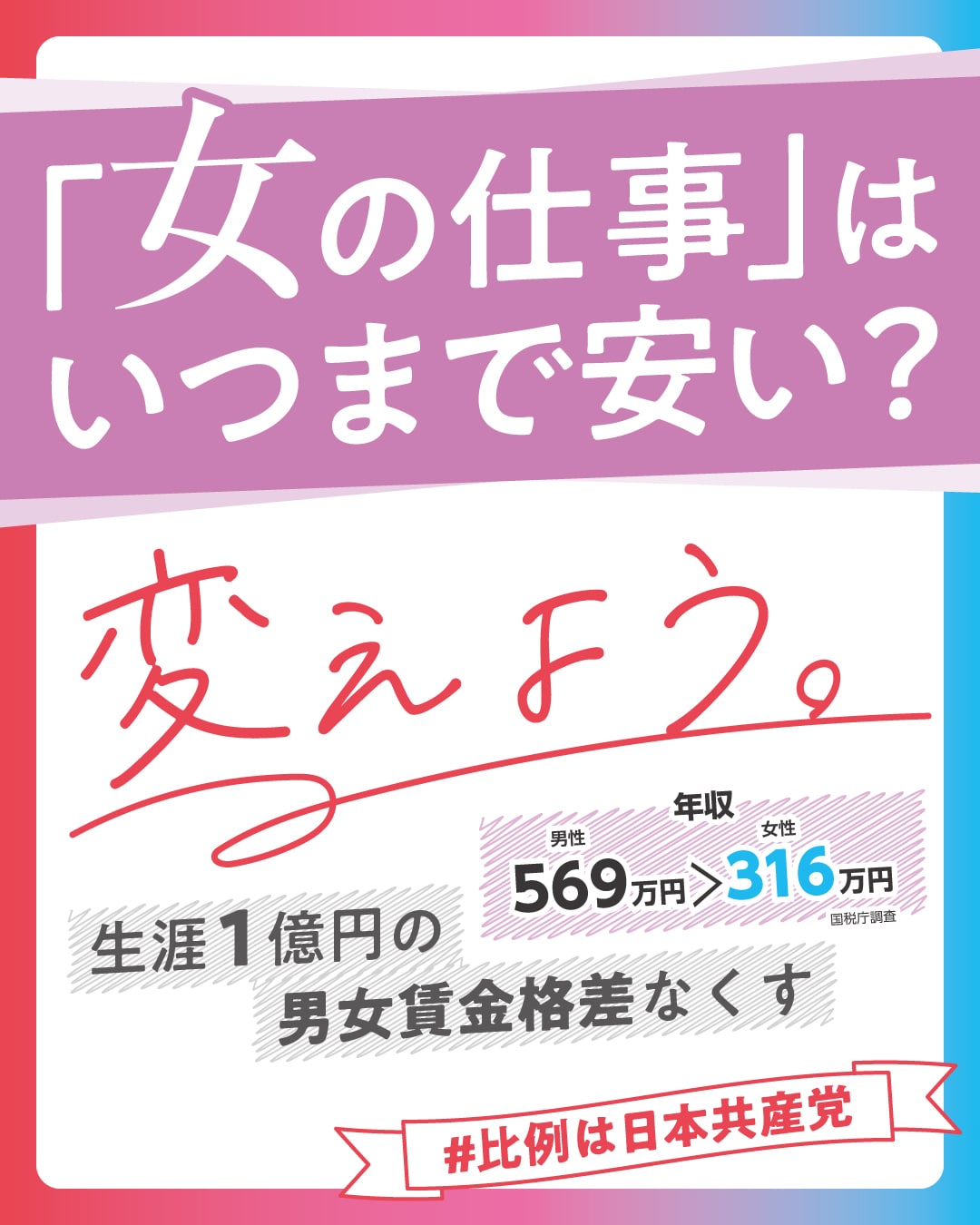 政策バナー:生涯1億円の男女賃金格差なくす