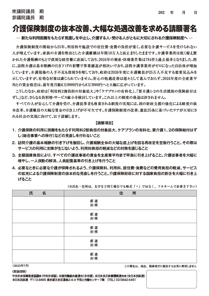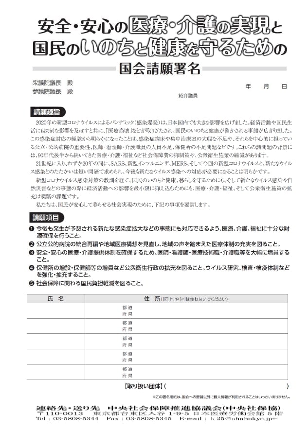 安全・安心の医療・介護の実現と国民のいのちと健康を守るための国会請願署名