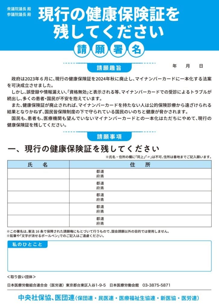 健康保険証廃止の中止を求め マイナンバーカード取得の強制に反対します