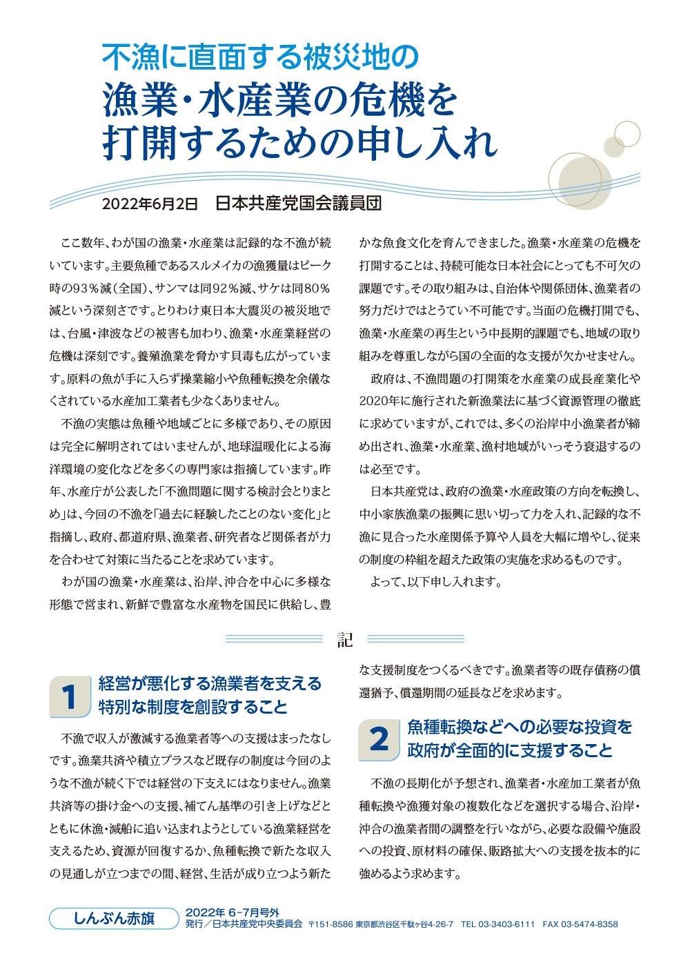不漁に直面する被災地の漁業・水産業の危機を打開するための申し入れ