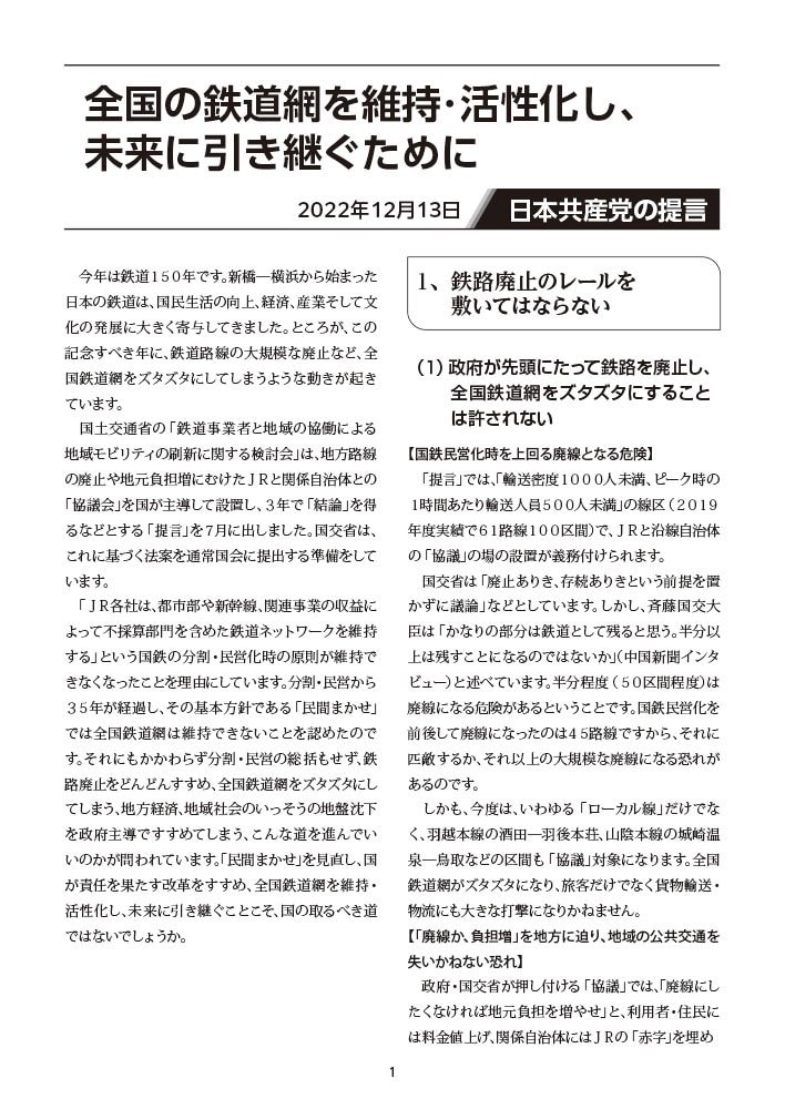 全国の鉄道網を維持・活性化し、未来に引き継ぐために 日本共産党の提言(両面プリント用)