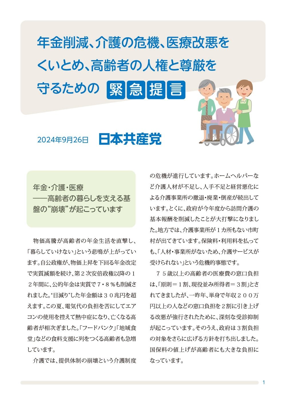 年金削減、介護の危機、医療改悪をくいとめ、高齢者の人権と尊厳を守るための緊急提言
